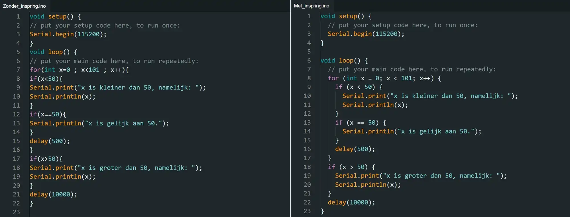 2. Structuur: Inspringen maakt de structuur van de code duidelijker. Vooral bij herhalingen zoals lussen (for) en voorwaarden (if). Hierdoor kun je snel zien welke stukken code bij elkaar horen.