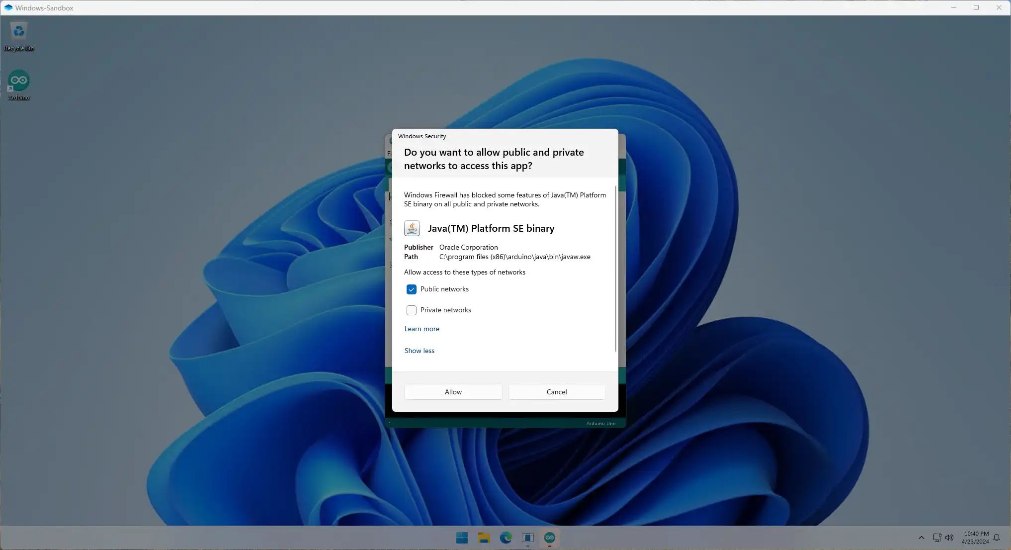 Bij de eerste keer kan het zijn dat je het venster ziet dat het meest links is afgebeeld, met de melding of Java toegang mag krijgen tot zowel openbare als particuliere netwerken.
