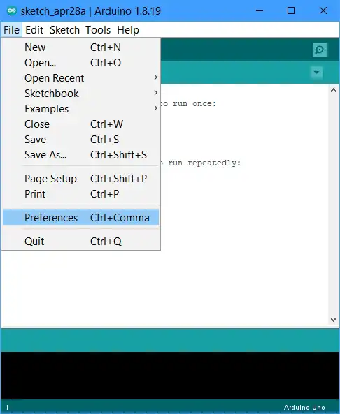 Als de Arduino IDE in het Engels is en je wil dit toch in het Nederlands, dan kun je dit aangeven in de ‘Preferences’ (boven in het menu ‘File’).